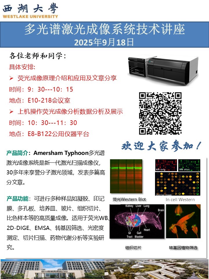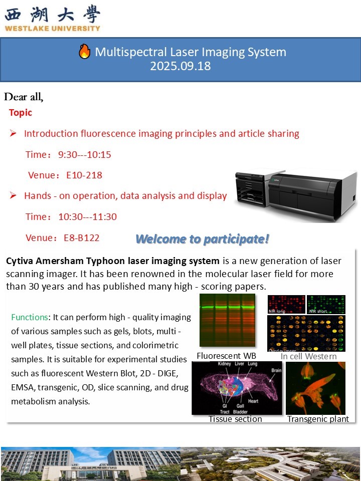当前位置: 首页 > 通知公告 > 技术交流 【技术交流会/Technical Seminar】多光谱激光成像系统技术讲座 作者:浏览量:时间:2025-09-16 各位老师、同学大家好! 平台已有设备多光谱激光成像系统将在本周四9月18日上午进行一场专业的技术交流,具体安排如下图海报,欢迎大家报名参加!