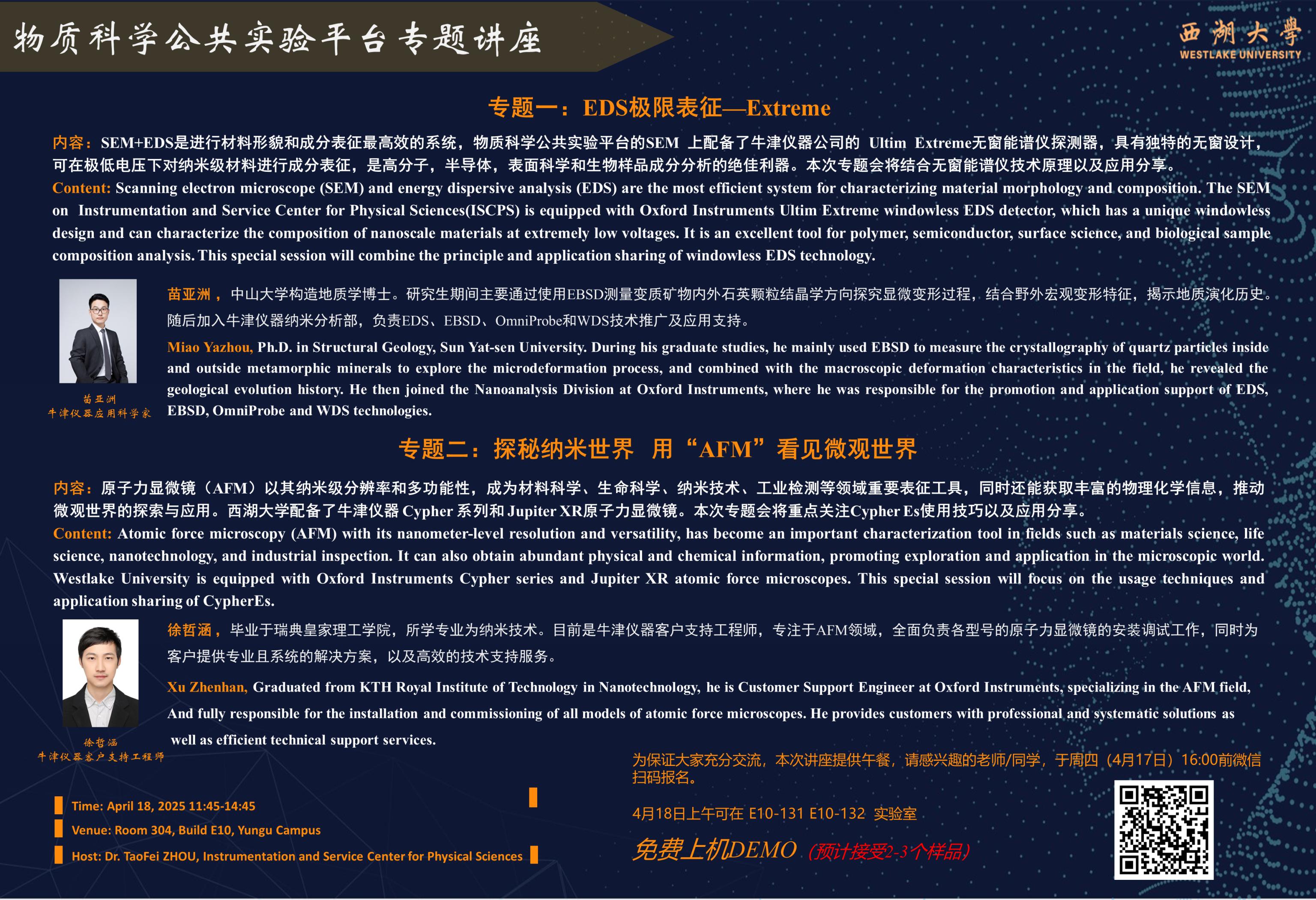 2025年4月18日(周五),上午11:45-14:45,云谷校区E10-304教室,将开展“物质科学公共实验平台专题讲座“之“Oxford EDS+AFM 原理以及应用分享会”。
