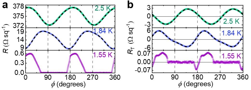 Tc 附近的电子向列性。(a)和(b)分别展示了三个代表性温度2.5、1.84和1.55 K下的纵向电阻和横向电阻随角度的周期性振荡