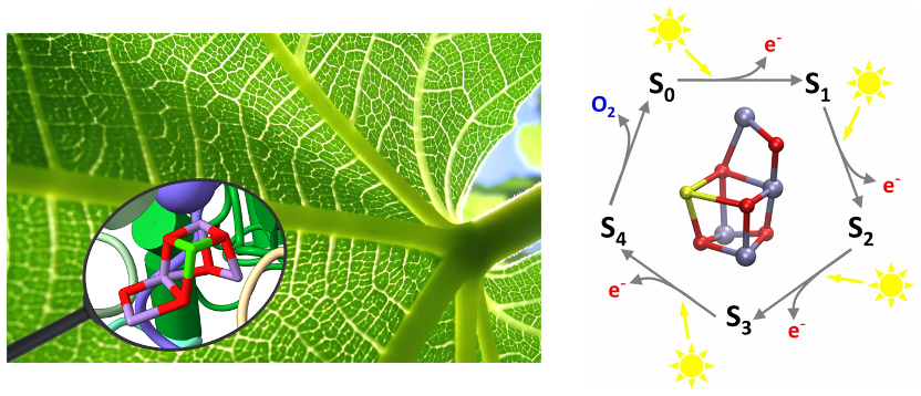 图1. (左)天然光合作用水氧化中心的放氧复合物,锰簇;(右)锰簇催化剂的S态循环