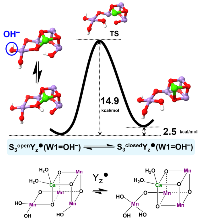 这一次,孙立成团队通过庞大而复杂的计算,预测锰簇在S3态到S4态过渡时,也就是在S3Yz●态时存在可逆异构化过程(图2,下)。这相当于揭开了“终极奥秘”S4态之前的一层面纱,它和S4态在时间上紧密衔接,可能构成了氧气形成的决速步骤,也对O-O键形成的机理产生重要影响。