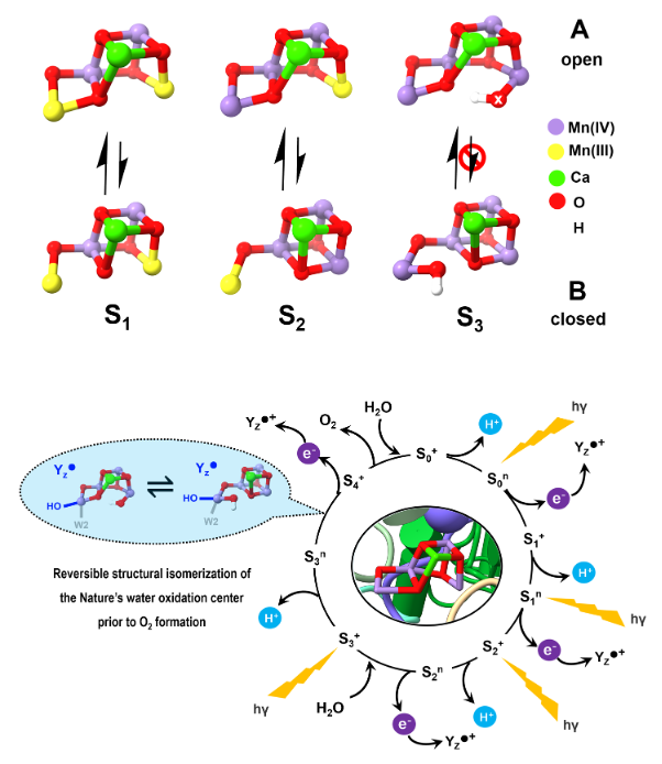 图2. (上) 锰簇S1-S3态的结构异构化行为;(下) 天然光合作用水氧化催化中心在放氧前期的可逆异构化过程