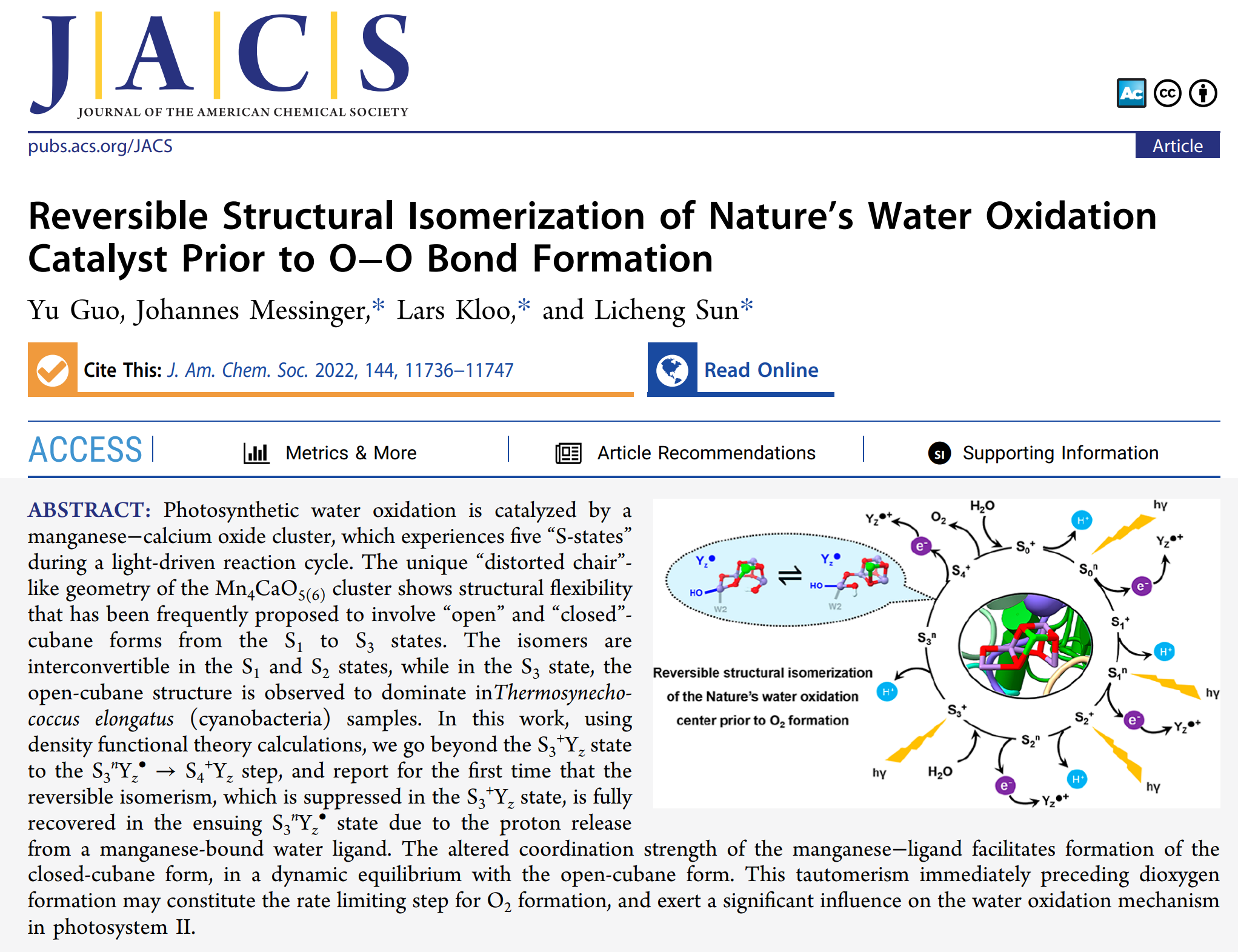 最近,西湖大学人工光合作用与太阳能燃料中心孙立成实验室在探索这一未解之谜的过程中取得阶段性进展。他们利用超级计算机和量子力学理论,揭示了天然光合作用中氧气产生前的化学催化过程。研究成果以《O-O键形成之前自然界水氧化催化剂的可逆异构化》为题发表在《美国化学学会杂志》上(J. Am. Chem. Soc. 2022, 144, 11736-11747)。西湖大学为第一通讯单位,博士后郭宇为第一作者,孙立成教授为通讯作者,该工作与瑞典学者合作完成。该研究工作得到了西湖大学专项经费的资助,并得到了西湖大学高性能计算中心的支持。