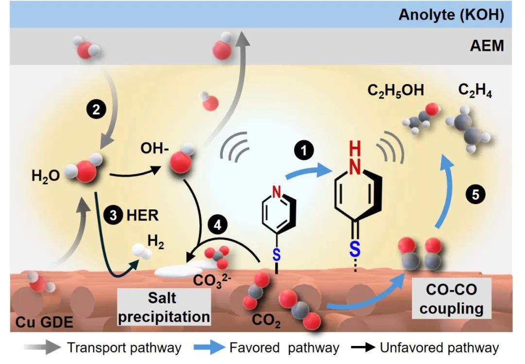 在工业生产场景中,电催化反应往往在“固-液-气”三相界面进行 —— 催化剂(固体)、水(液体)和二氧化碳(气体)在这里相遇。在三相界面的特殊环境中,4-巯基吡啶会发生神奇的“变身”—— 从“硫醇形态”转变成“硫酮形态”。让催化剂表面变得更“疏水”(减少多余水的干扰),还能把二氧化碳分子“拉”到催化剂附近,减少浪费。