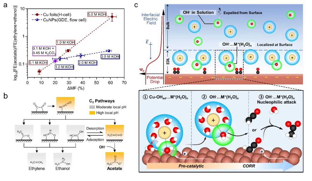 通过对界面水分子的拉曼信号观测,团队发现电极表面吸附的羟基(OHad)之间,与电解质阳离子之间存在着一种复杂的非共价相互作用,在催化剂表面形成“OHad…M⁺(H₂O)ₙ复合物”结构。这会让导致一氧化碳更容易被这些富集在催化剂表面的OH物种进行亲核进攻,从而选择性地转化为乙酸,而不是乙烯或乙醇。