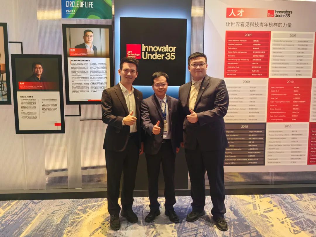 11月14日,西湖大学师恩政(左)和王睿(右)在《麻省理工科技评论》颁奖现场,分别获得亚太区和全球区的“35岁以下科技创新35人”,西湖大学材料科学讲席教授黄嘉兴(中)作为颁奖嘉宾出席。