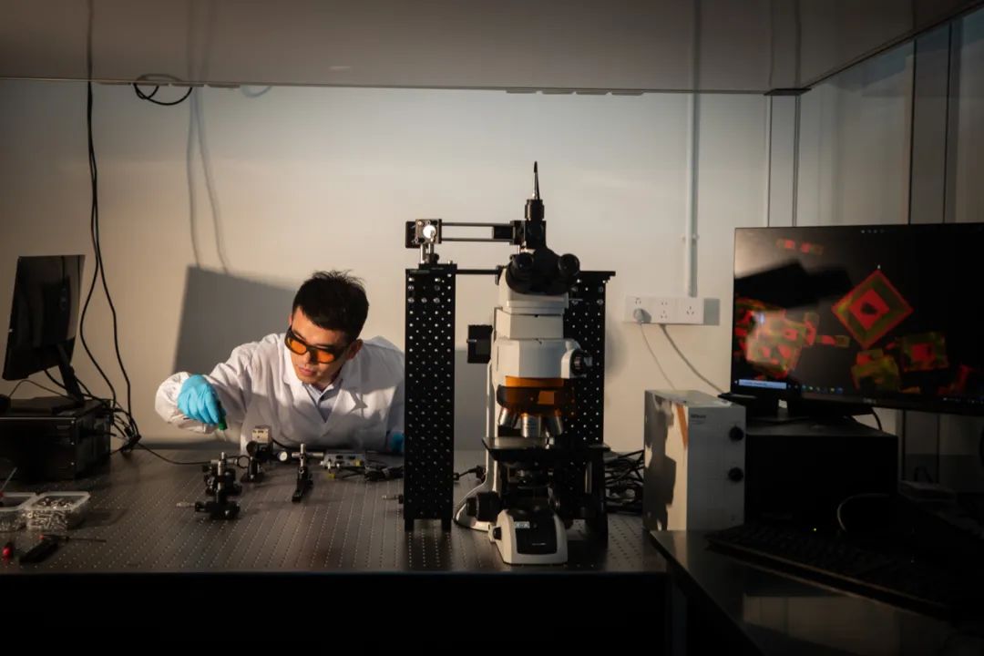 但不同的是,师恩政团队要调控晶体长成的结构,比如两种不同种类的二维钙钛矿生长在一起,形成一个外延的同心异质结构,甚至是更复杂的超晶格。师恩政戴上护目镜,把一小份材料样品拿到显微镜下,在紫外光的照射下,不同类型的钙钛矿会显示不同的颜色。
